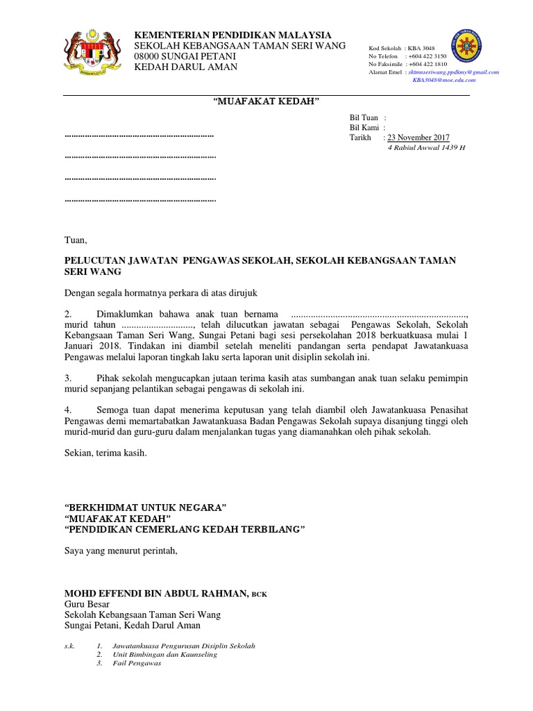 Surat Pelucutan Jawatan Pengawas Sekolah Pdf
